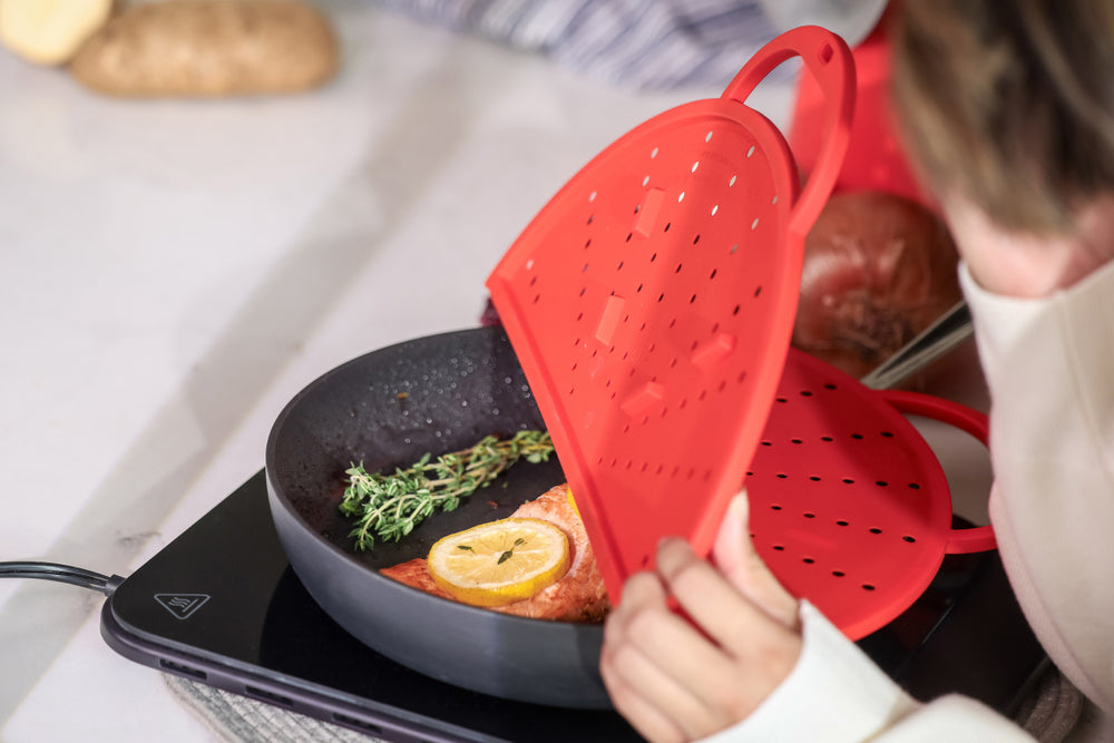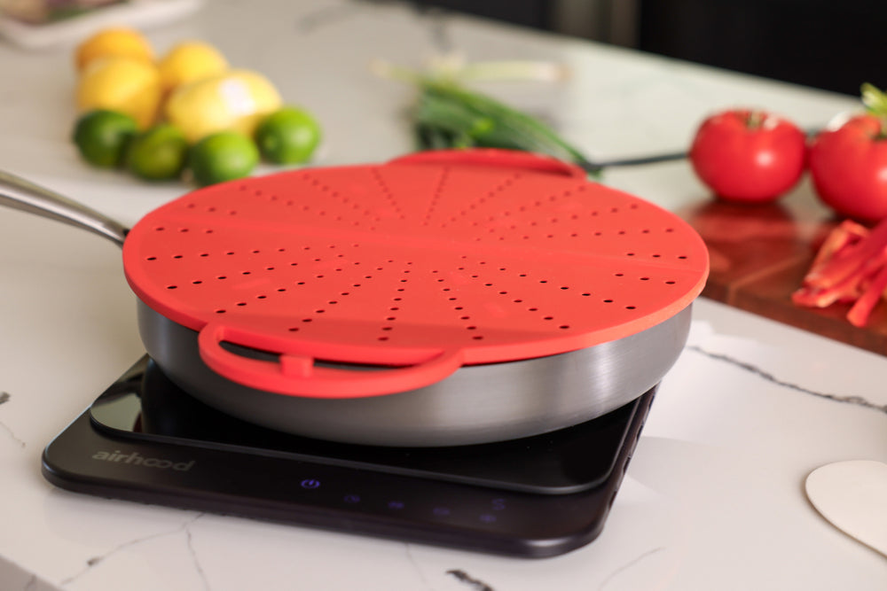 Simply open one side of the splatter screen for checking or giving your food a quick stir